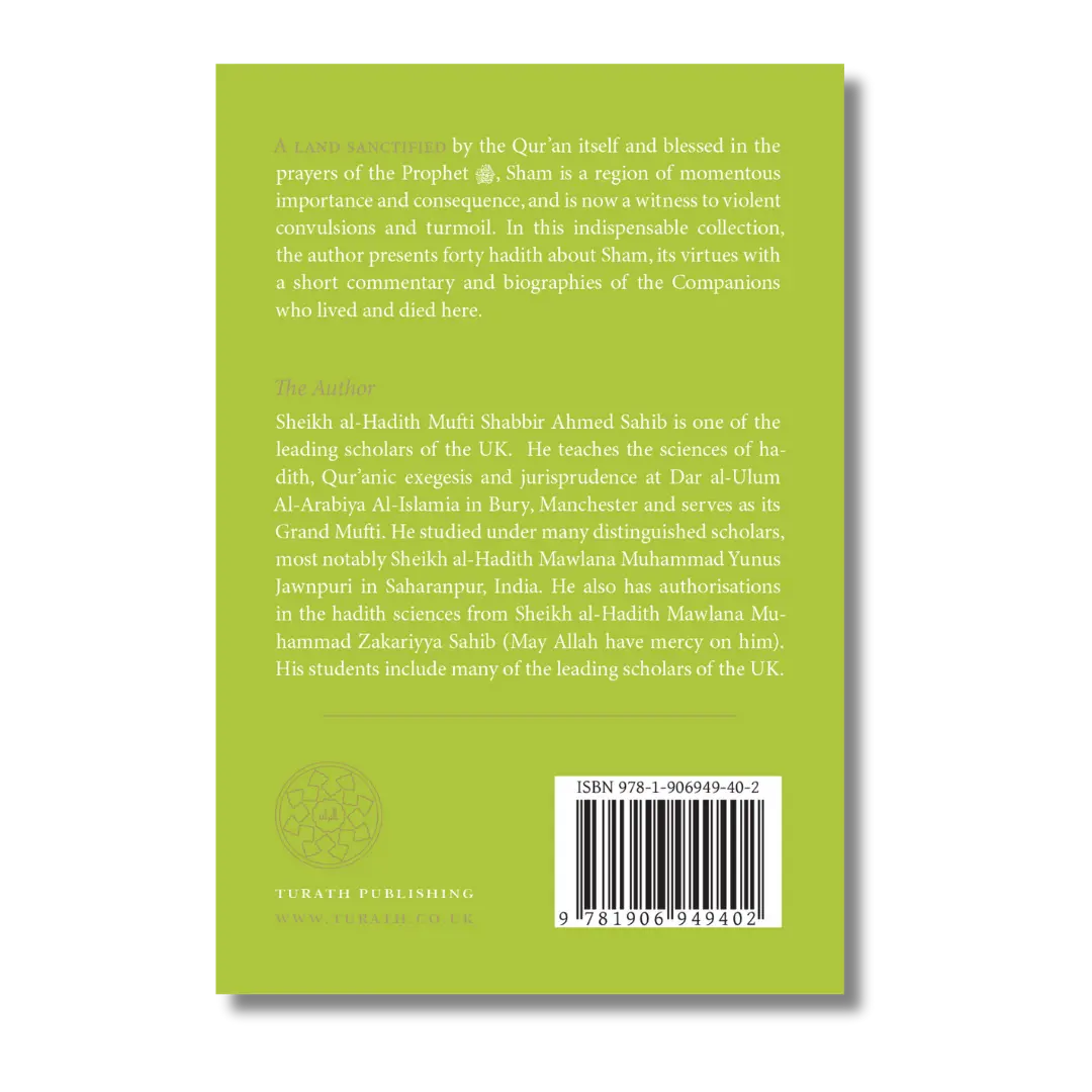 Al-Arba'in on The Virtues of Sham And Its People Sham is an area which encompasses modern day Syria, Palestine, Jordan, Lebanon, parts of Northern Egypt, parts of Southern Turkey and parts of Western Iraq. A land sanctified by the Quran itself and blessed in the prayers of the Prophet (may Allah bless him and grant him peace), Sham is a region of momentous importance and consequence, and is now a witness to violent convulsions and turmoil. In this indispensable collection, the author presents forty hadith about Sham, its virtues with a short commentary and biographies of the Companions who lived and died here.