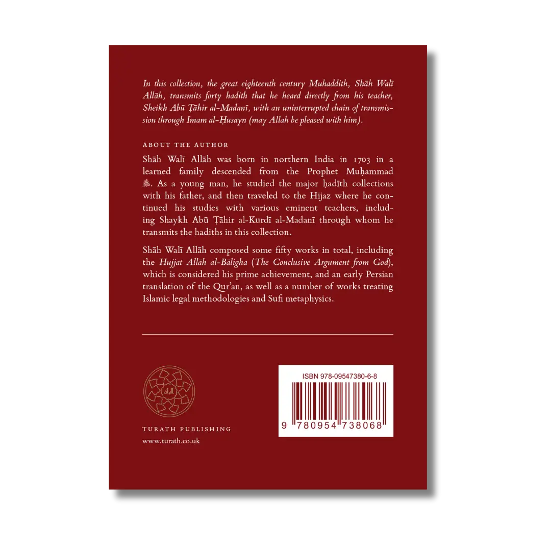 In this collection, the great eighteenth century Hadith master, Shah Wali Allah, transmits forty hadith that he heard directly from his teacher, Sheikh Abu Tahir al-Madani, with an uninterrupted chain of transmission through Imam al-Husayn (may Allah be pleased with him).