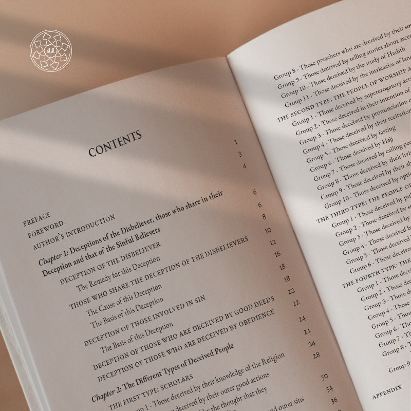 The text examines the various religious activities that take place in a believers life, be they the construction of masjids, the delivery of lectures, charitable contributions in the name of Allah ﷻ, or the recitation of the Qur'an. Imam al-Ghazali's articulation of these matters persuades the reader to remain vigilant in every aspect of the Religion. His overarching theme throughout the book revolves around the term ghurür which, in the context of this work, can be translated as self-deception. As seen in many of his other writings, he provides compelling examples that resonate with all readers.