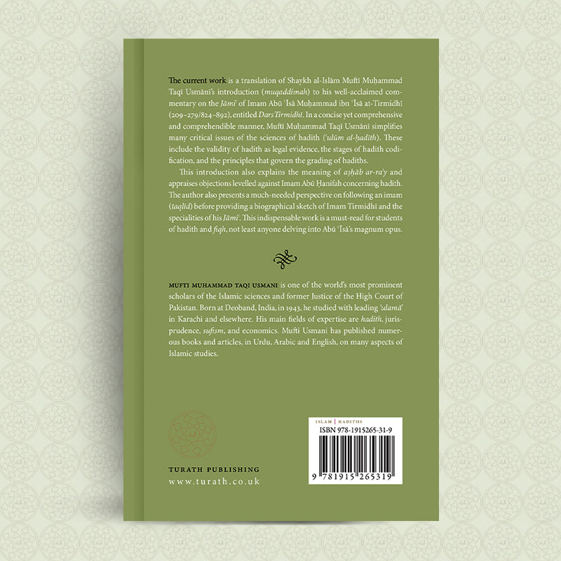 The current work is a translation of Shaykh al-Islām Muftī Muḥammad Taqī Usmānī’s introduction (muqaddimah) to his well-acclaimed commentary on the Jāmiʿ of Imam Abū ʿĪsā Muḥammad ibn ʿĪsā at-Tirmidhī (209–279/824–892), entitled Dars Tirmidhī. In a concise yet comprehensive and comprehendible manner, Muftī Muḥammad Taqī Usmānī simplifies many critical issues of the sciences of hadith (ʿulūm al-ḥadīth). These include the validity of hadith as legal evidence, the stages of hadith codification, and the principles that govern the grading of hadiths. This introduction also explains the meaning of aṣḥāb ar-raʾy and appraises objections levelled against Imam Abū Ḥanifah concerning hadith. The author also presents a much-needed perspective on following an imam (taqlīd) before providing a biographical sketch of Imam Tirmidhī and the specialities of his Jāmiʿ. This indispensable work is a must-read for students of hadith and fiqh, not least anyone delving into Abū ʿĪsā’s magnum opus.